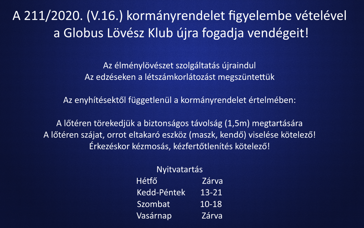 A Globus sportlőtér augusztusban szombat-vasárnap ZÁRVA tart. Hétköznapokon változatlan nyitvatartási időben várjuk kedves vendégeinket!
